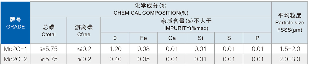 Mo2C=203.88,含碳5.89%,为深灰色金属状粉末,其结晶为密排六方晶格,密度9.18克/厘米3, 熔点2690C。作为一类具有很高熔点和硬度、良好热稳定性和机械稳定性、极好抗腐蚀特性的新型功能材料,已广泛用于各种耐高温、耐磨擦和耐化学腐蚀等领域。具有类似贵金属的电子结构和催化特性,可广泛用于有氢参与的反应如烷烃异构化、不饱和烃加氢、加氢脱硫和脱氮等反应的催化剂。