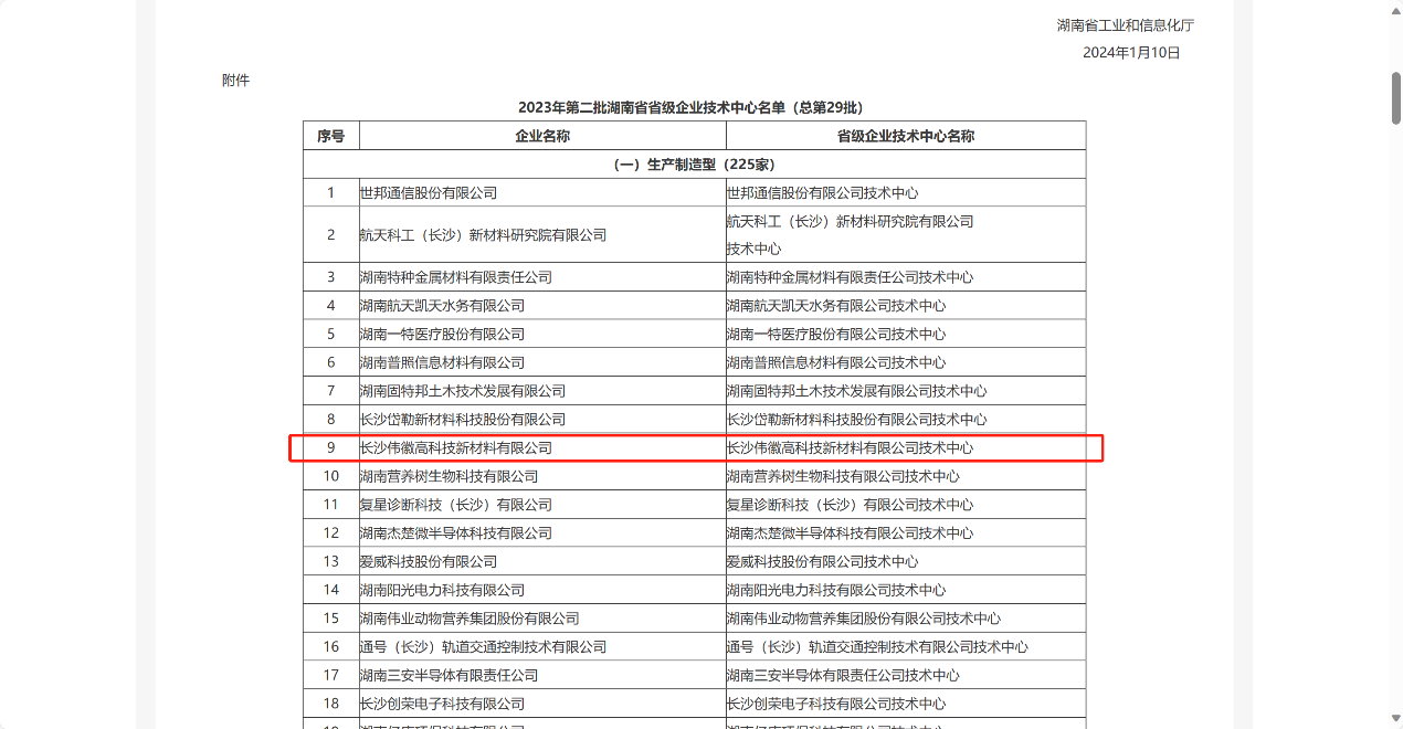 2024年1月10日,湖南省工业和信息化厅《关于公布2023年第二批湖南省省级企业技术中心名单(总第29批)的通知》(湘工信科技〔2024〕14号),同意认定长沙伟徽高科技新材料有限公司技术中心为湖南省省级企业技术中心。